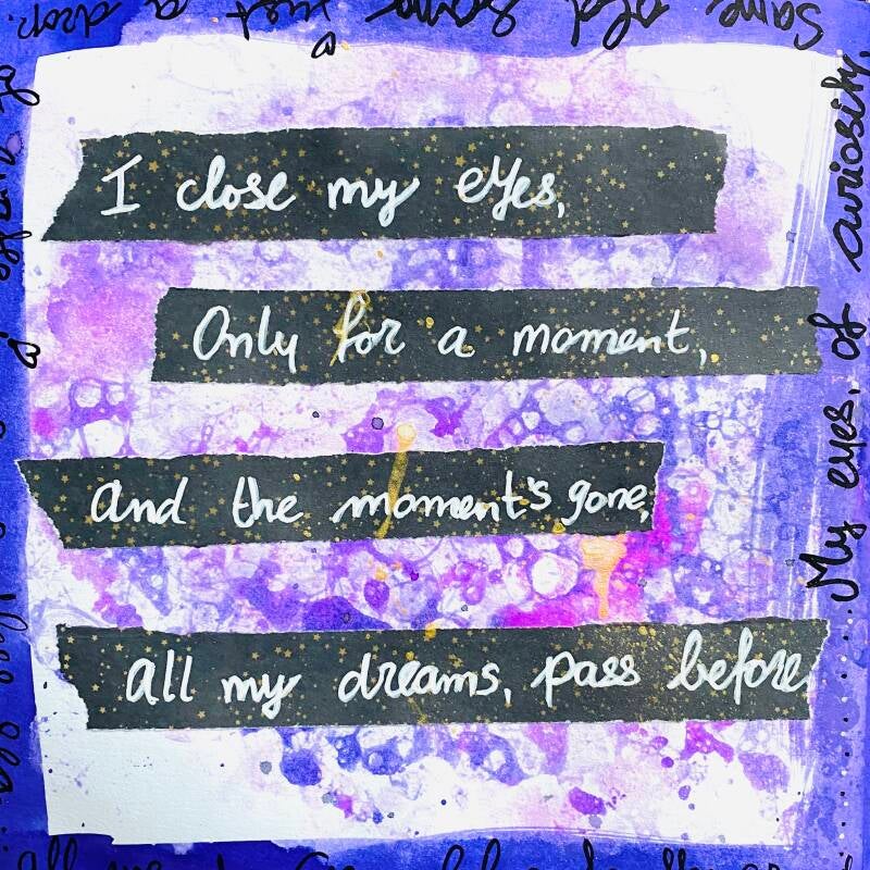 De tweede pagina's van mijn Art Journal heb ik gemaakt door bellen te blazen met ecoline. Ik tekende paardenbloemen en gebruikte een songtekst van Kansas.