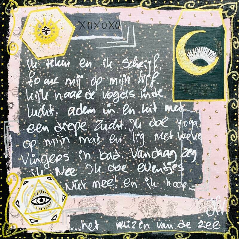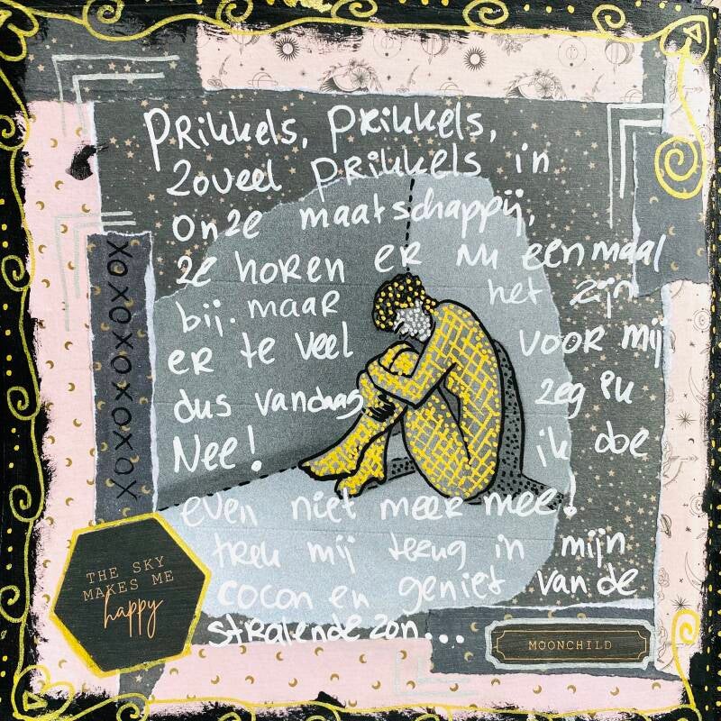 Momenteel ben ik behoorlijk overprikkeld dus het voelde erg fijn om daar een gedicht over te maken en dit op papier te zetten. Als collage heb ik de foto van het boek van Rosan van der Zee gebruikt. Haar houding en boek zijn zo mooi kwetsbaar. Haar meeslepende boek Ingesloten over haar opnamen in een psychische instelling is ook een aanrader! https://www.bol.com/nl/nl/b/rosan-van-der-zee/601943265/