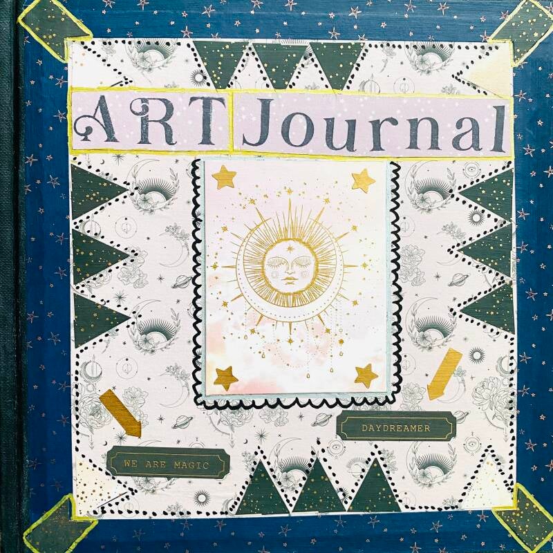 Bij een Art Journal hoort natuurlijk een leuke creatieve voorkant! Deze maakte ik met papier, washitape en stickertjes van de Action en wat acrylverfmarkers. Opgeplakt met gel medium mat en een laagje nog eroverheen gesmeerd.