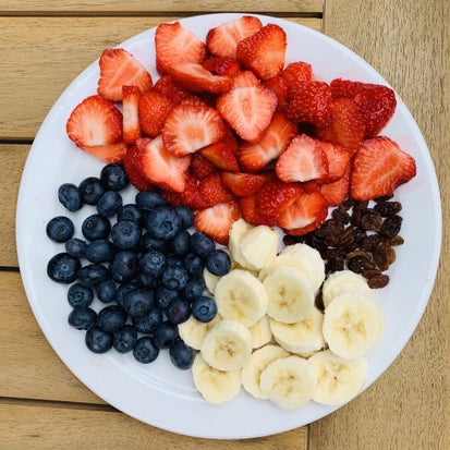 Beleg de boterham daarna met aardbeien, banaan, bosbessen of rozijntjes.