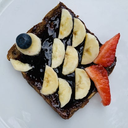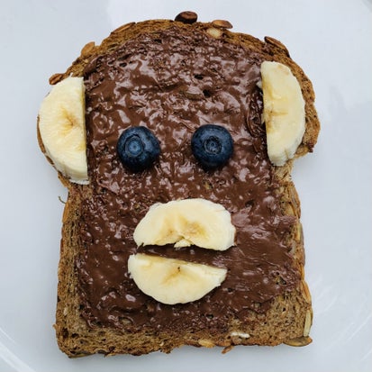 Beleg de boterham met banaan, aardbeien en bosbessen of rozijntjes. Miauw.