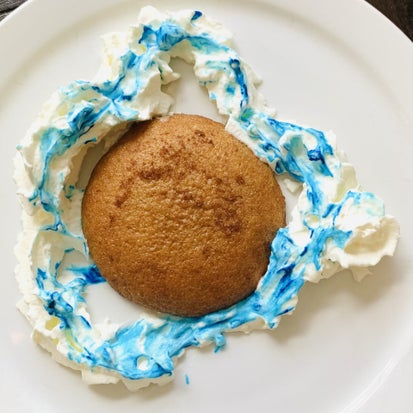 Als je wilt kun je met een satéprikker wat blauwe voedingskleurstof door de slagroom heenroeren. Let op dat je echt maar heel weinig gebruikt, want het geeft heel veel kleur af! Die kleur krijg je niet altijd zomaar weer van je vingers of je lippen af als je het niet goed uitsmeert.