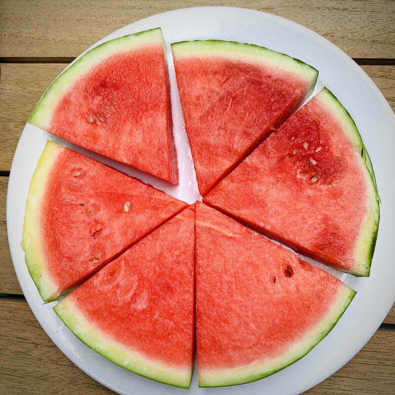 Snijd heel voorzichtig een plak af van de watermeloen. Leg deze op een bord en snijd hem in stukken.