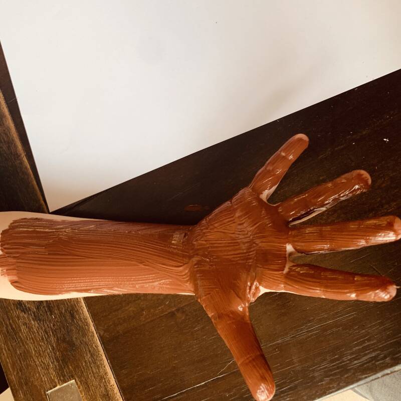 Druk voorzichtig de hand en arm op het papier en druk het een beetje aan. Verf met een kwast de stam van de boom eventueel wat bij.