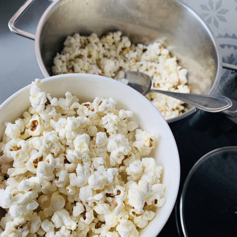 Wacht tot het ploppen is gestopt. Laat nu eerst de popcorn in de pan wat afkoelen. Daarna kun je met een grote lepel voorzichtig de bovenste popcorn eraf scheppen. Schep niet te diep, want op de bodem liggen misschien nog wat keiharde maiskorrels waar je niet je kiezen op wil breken.