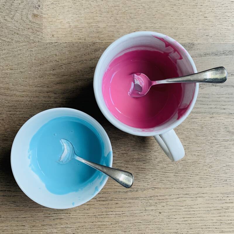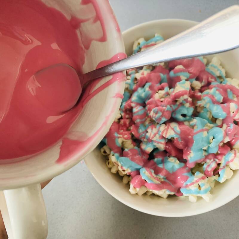 Je kan ook twee kleuren gebruiken. Voor de eenhoorn popcorn gebruikte ik eerst licht blauwe en daarna roze Deco Melts.