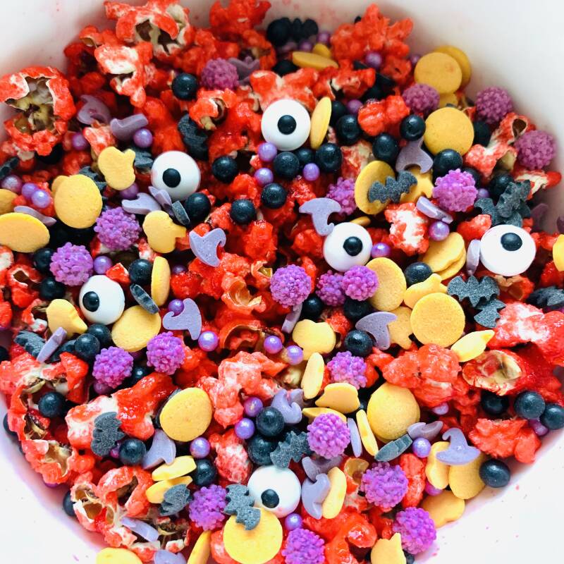 Je kan ook rode of oranje melts gebruiken en combineren met Halloween Sprinkles en suikeroogjes. Dan heb je zelfgemaakte Halloween Popcorn.