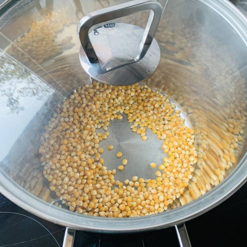 Als de olie dampt dan is het tijd om de popcorn mais in de pan te doen. Zorg ervoor dat alle maiskorrels de bodem raken, dus doe er niet te veel in. Doe de deksel erop en wachten maar!