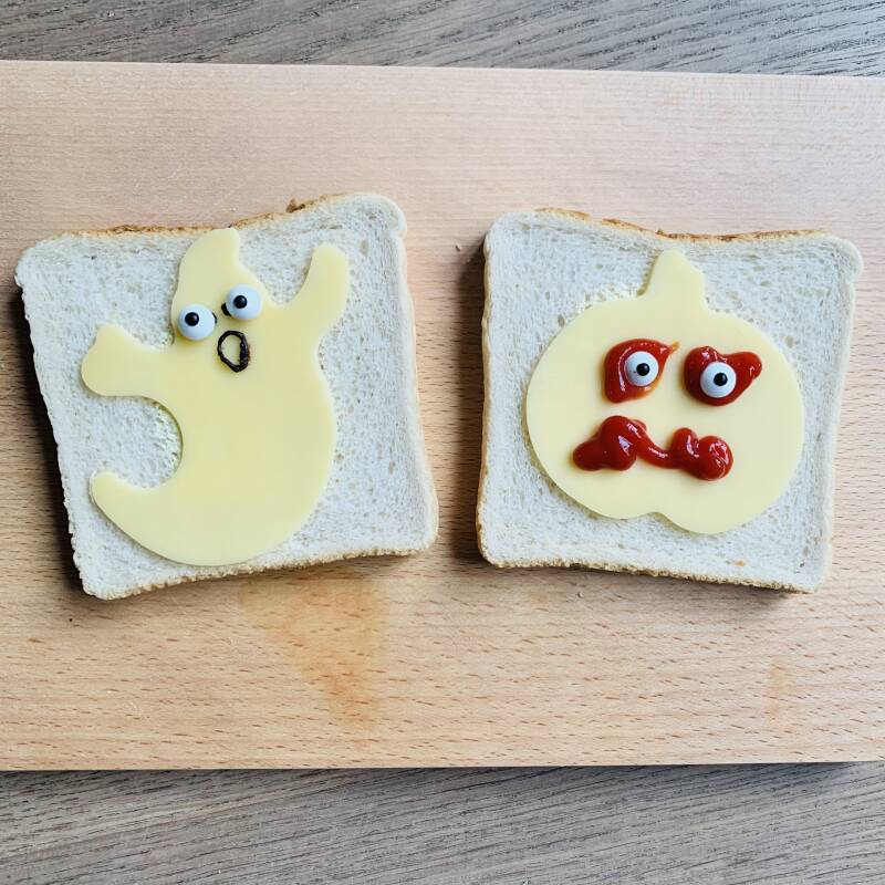 Benodigdheden: brood, plakken kaas of kokosbrood, een spook of pompoen koekjes cutter, ketchup en/of een eetbare decoratiestift (bv van Dr. Oetker) en suikeroogjes.