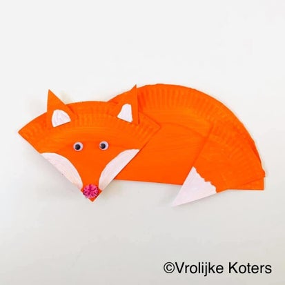 Verf de witte delen zoals op de foto (de wangen van de vossenkop, het puntje van de staart en het binnenste van de oortjes). Plak wiebeloogjes op de kop en een ponpon als neusje of teken deze met een zwarte stift erop.