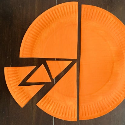 Verf het hele bordje oranje en laat het drogen. Knip het bordje in stukken zoals op de foto hiernaast.