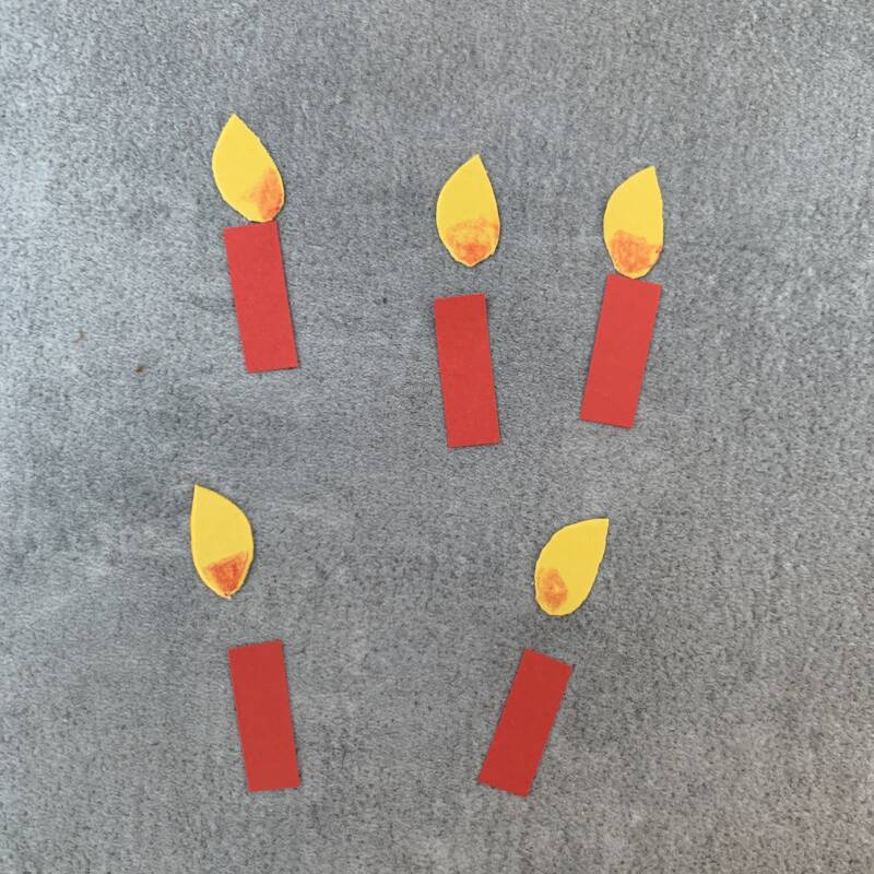 Als je het leuk vind kun je kaarsjes in de boom plakken: Knip uit rood papier de steeltjes van de kaarsjes en uit geel papier de vlammetjes. Teken met een rode stift het midden van de vlam.