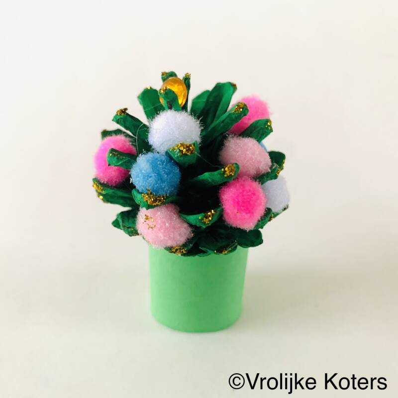 Benodigdheden: dennenappel, groene verf, kleine ponponnetjes, lijm, glitterlijm, stukje gekleurd karton, edelsteen stickertje.