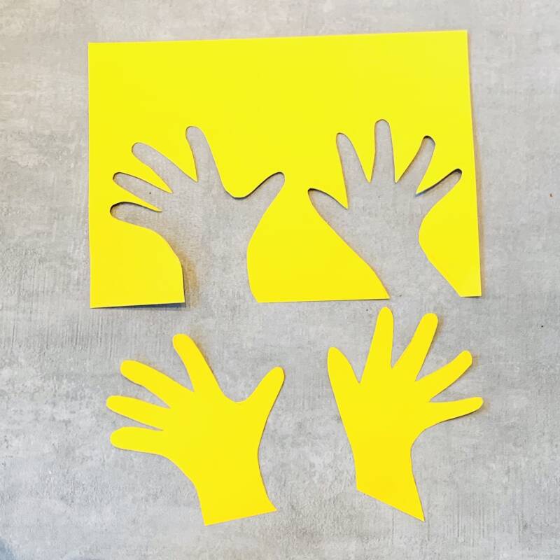 Trek de kinderhandjes om op gekleurd karton en knip deze uit.