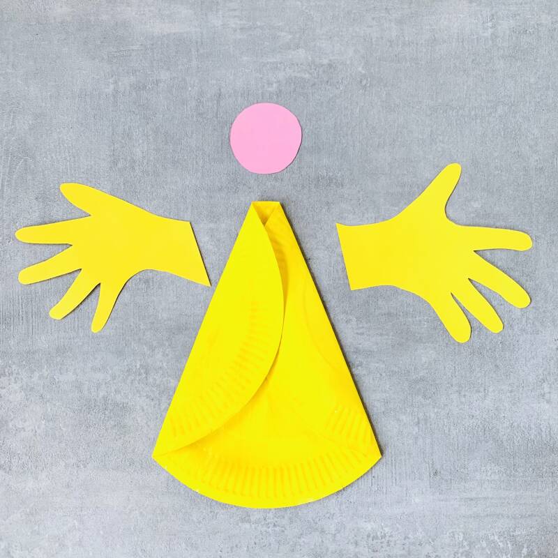 Nu heb je alle drie de onderdelen klaar: de handjes uit karton geknipt, het gevouwen en geverfde bordje en het hoofdje.