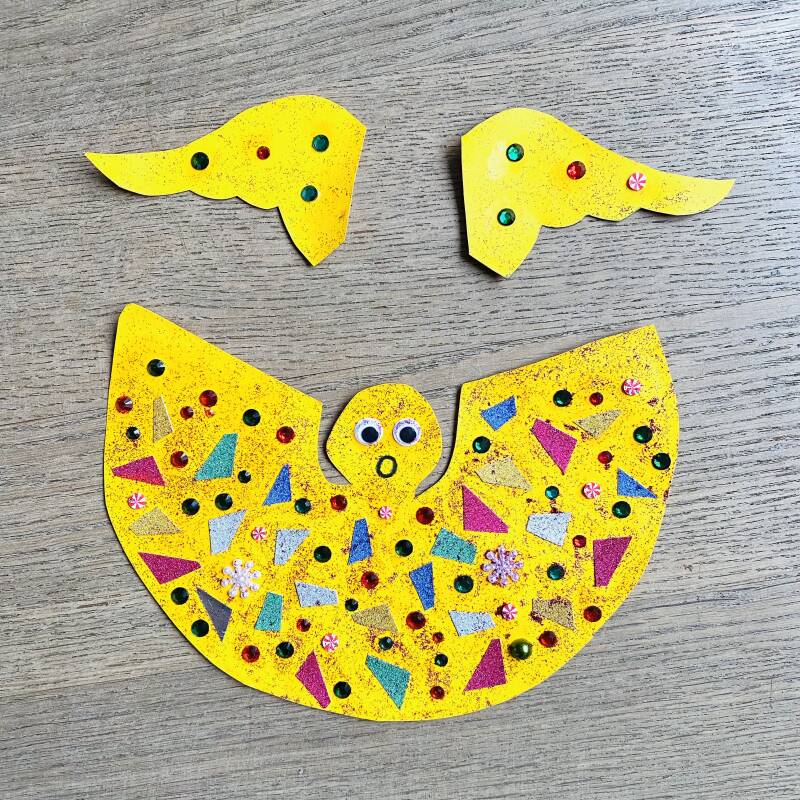 Maak de achterkant van het engeltje vast met lijm, plakband of een nietmachine, zodat het engeltje kan staan. Vouw het uiteinde van de vleugels om zodat er een plakrandje ontstaat. Plak dan de vleugels op het engeltje.