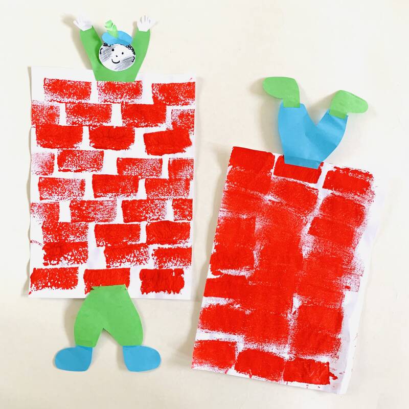 Stempel een schoorsteen met rode verf en een schuursponsje en plak een Pietje op!