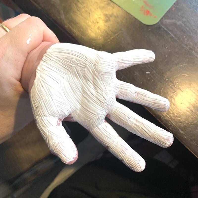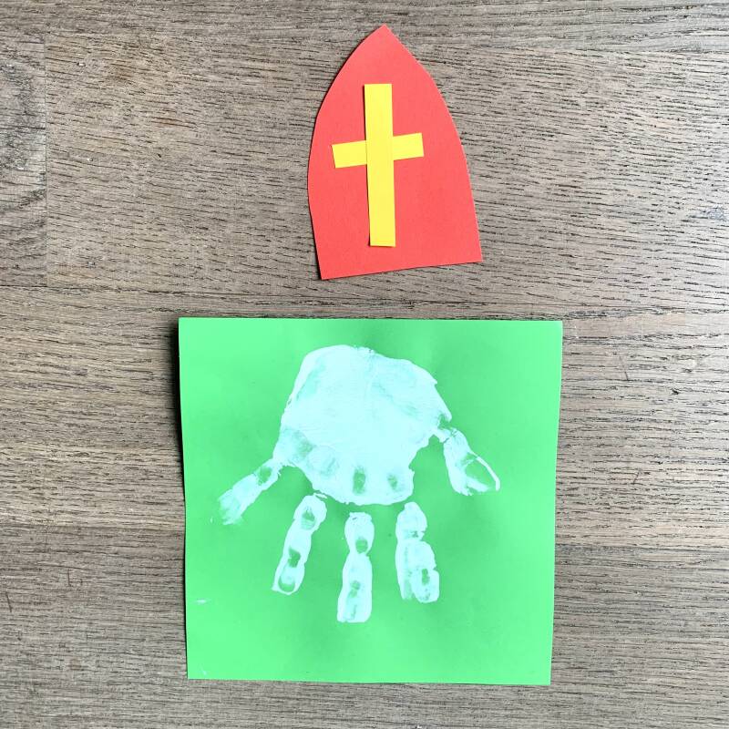 Als de verf droog is kun je de mijter op je handafdruk plakken met lijm. Teken met een zwarte stift een neus, mond en twee oogjes of gebruik wiebeloogjes.