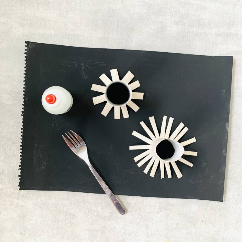 Pak de vloeibare lijm, de vork en de twee wc-rollen. Knip met een schaar de wc-rollen in zoals op de foto.