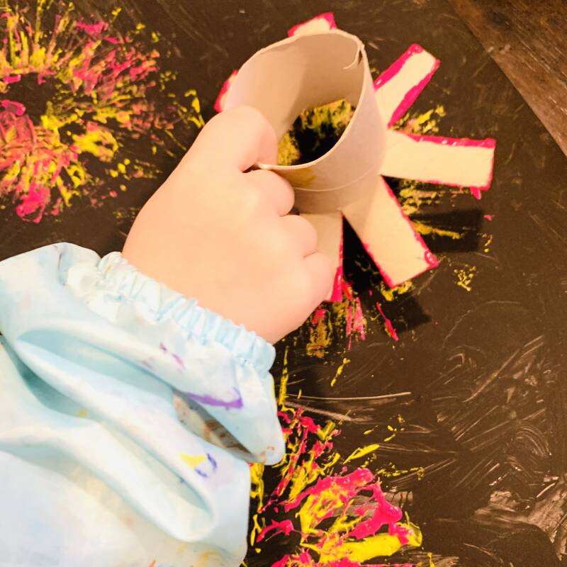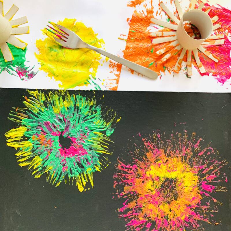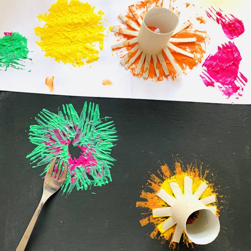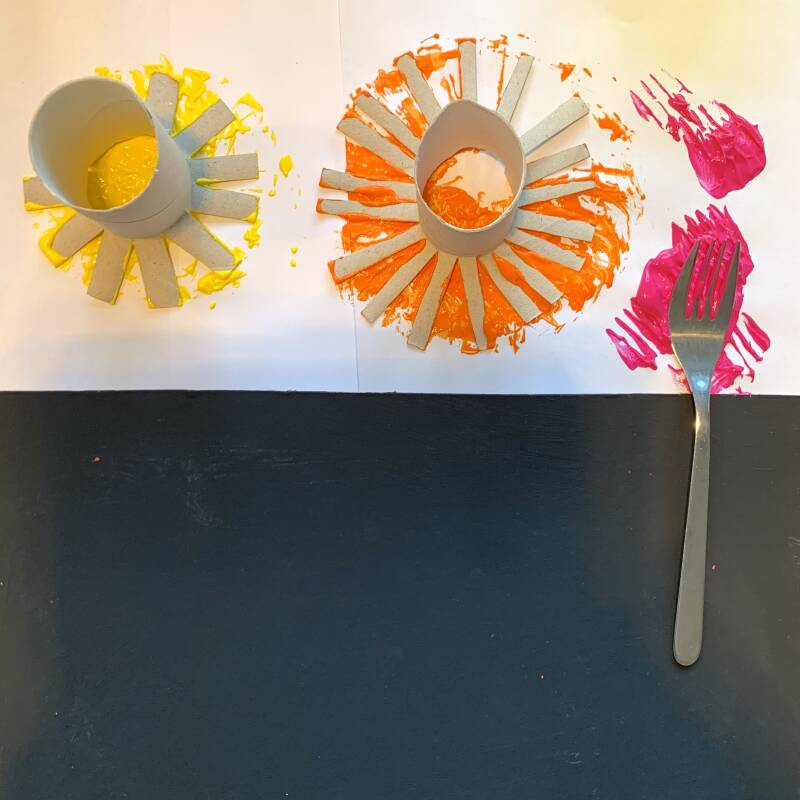 Doe wat felle kleuren verf op een a4 wit papier of oude krant en doop de wc-rollen en de vork erin.