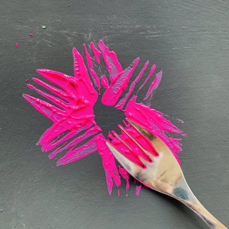 Maak de spettervorm zo groot als je zelf wilt! Doe ook nog wat lijm over de verf die je hebt gestempeld met de vork en de wc-rol heen.