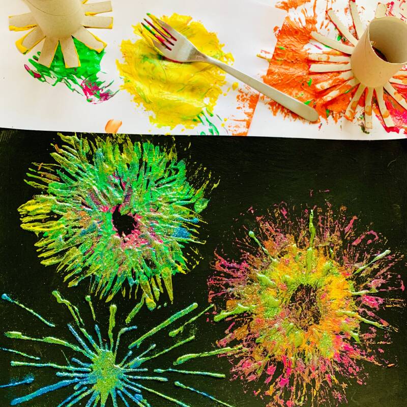 We gaan drie verschillende technieken gebruiken: verf stempelen met de wc-rollen, verf stempelen met de vork en met de vloeibare lijm vuurwerk maken! (Je kunt hiervoor ook de glitterlijm gebruiken).