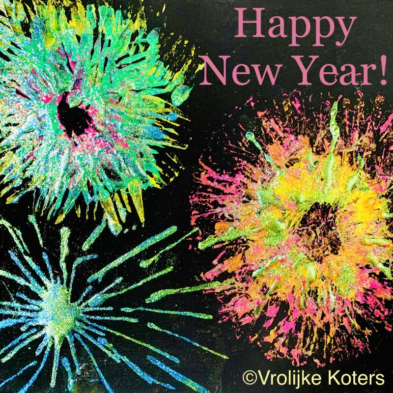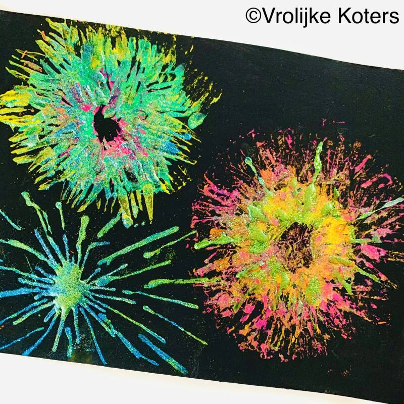 Hieronder zie je mijn voorbeeld vuurwerk kunstwerk en het resultaat van mijn kleine meid van bijna drie jaar oud.