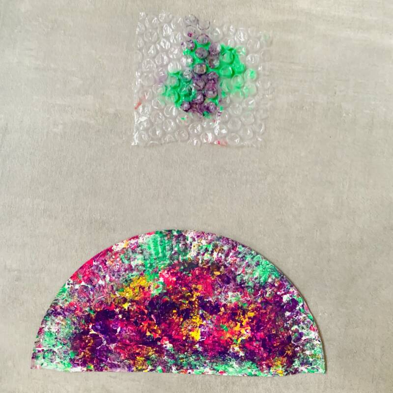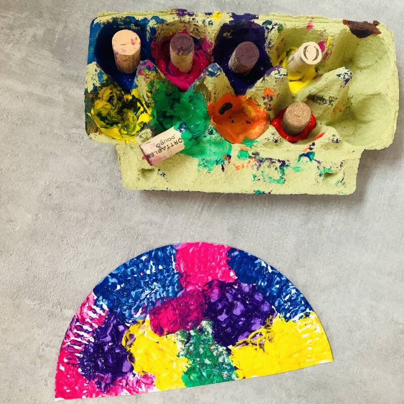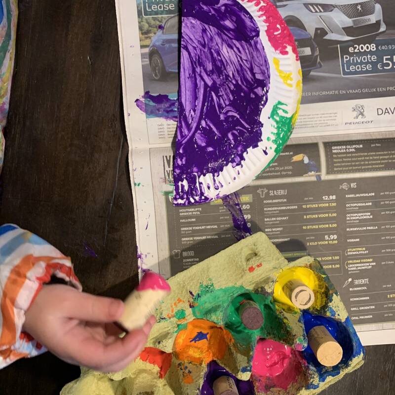 Of gebruik zoals mijn dochtertje hier doet gewoon lekker alles door elkaar heen: het bubbeltjesplastic, de kurken en een kwast!
