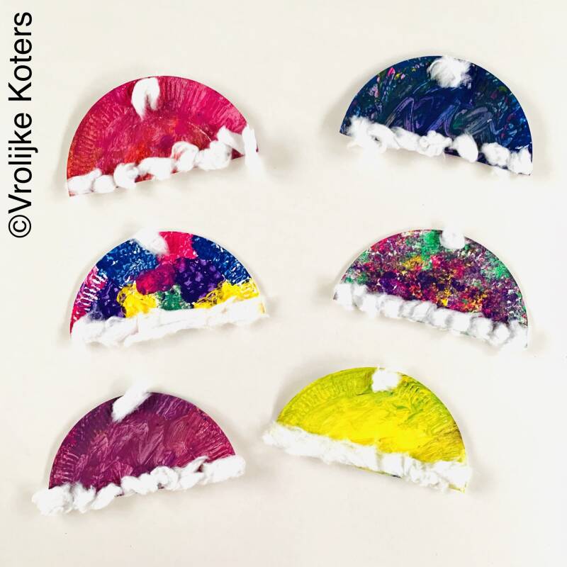 Benodigdheden: verf, kartonnen bordje, schaar, watten, lijm. Eventueel: bubbeltjesplastic of kurken.