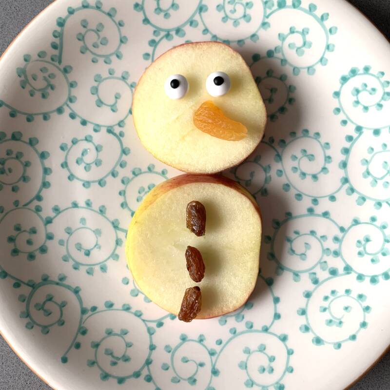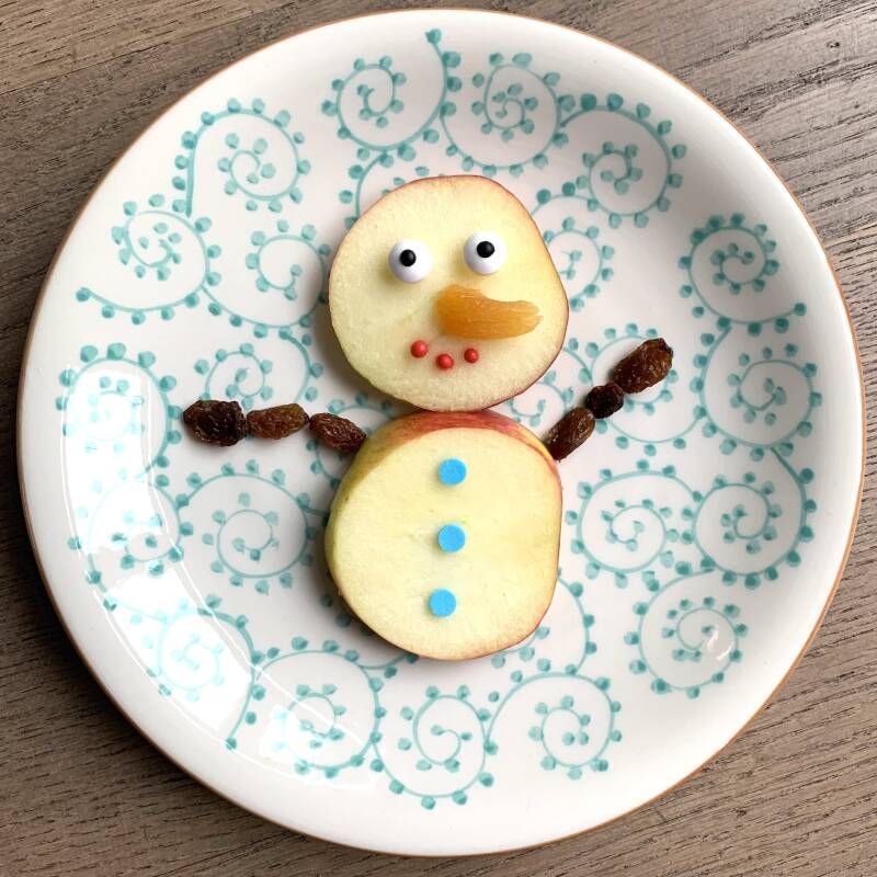 Leg twee ronde plakjes appel op een bordje en laat je kindje er een leuke sneeuwpop van maken. Het is handig om een voorbeeldje te maken of te laten zien.