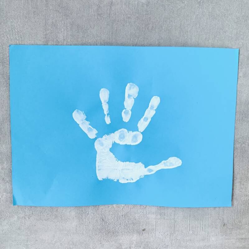 Benodigdheden: witte verf, blauw papier, stiften en je hand.