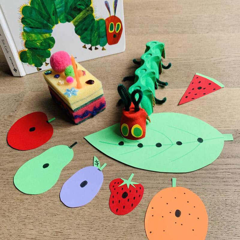 Je kan Rupsje Nooitgenoeg ook zelf maken van een eierdoos! Maak ook het eten, lees het boekje en speel daarna het verhaaltje na!