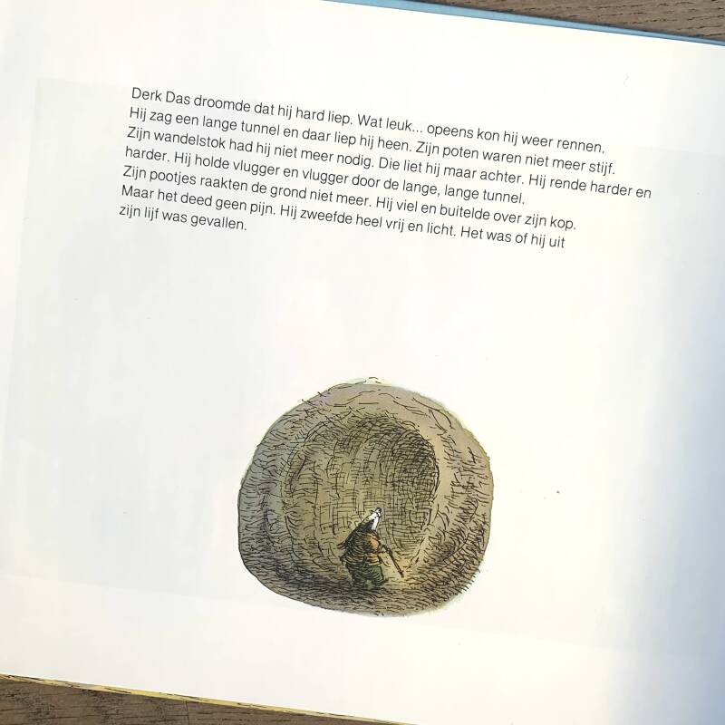 Wat ik erg mooi vind aan het boek is dat het niet voor een bepaald geloof kiest. Derk Das gaat door een lange tunnel heen. Daar heeft hij zijn stok niet meer nodig en is het net alsof hij zweeft. Verder blijft het open om te vertellen als ouder of leerkracht wat jij wilt dat het kind te horen krijgt.