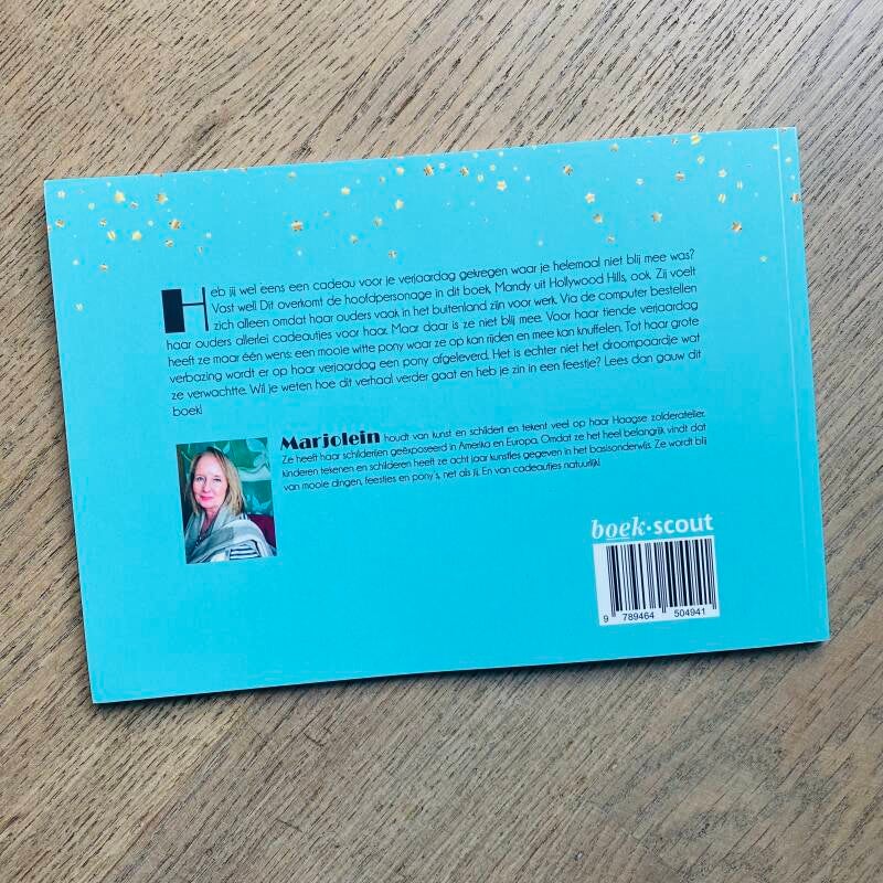 Heb jij weleens een cadeau gekregen voor je verjaardag waar je helemaal niet blij mee was? Vast wel! Dit overkomt de hoofdpersonage in dit boek, Mandy uit Hollywood Hills, ook. Zij voelt zich alleen omdat haar ouders vaak in het buitenland zijn voor werk. Via de computer bestellen haar ouders allerlei cadeautjes voor haar. Maar daar is ze niet blij mee. Voor haar tiende verjaardag heeft ze maar één wens: een mooie witte pony waar ze op kan rijden en mee kan knuffelen. Tot haar grote verbazing wordt er op haar verjaardag een pony afgeleverd. Het is echter niet het droompaardje wat ze verwachtte. Wil je weten hoe dit verhaal verder gaat en heb je zin in een feestje? Lees dan gauw dit boek!
