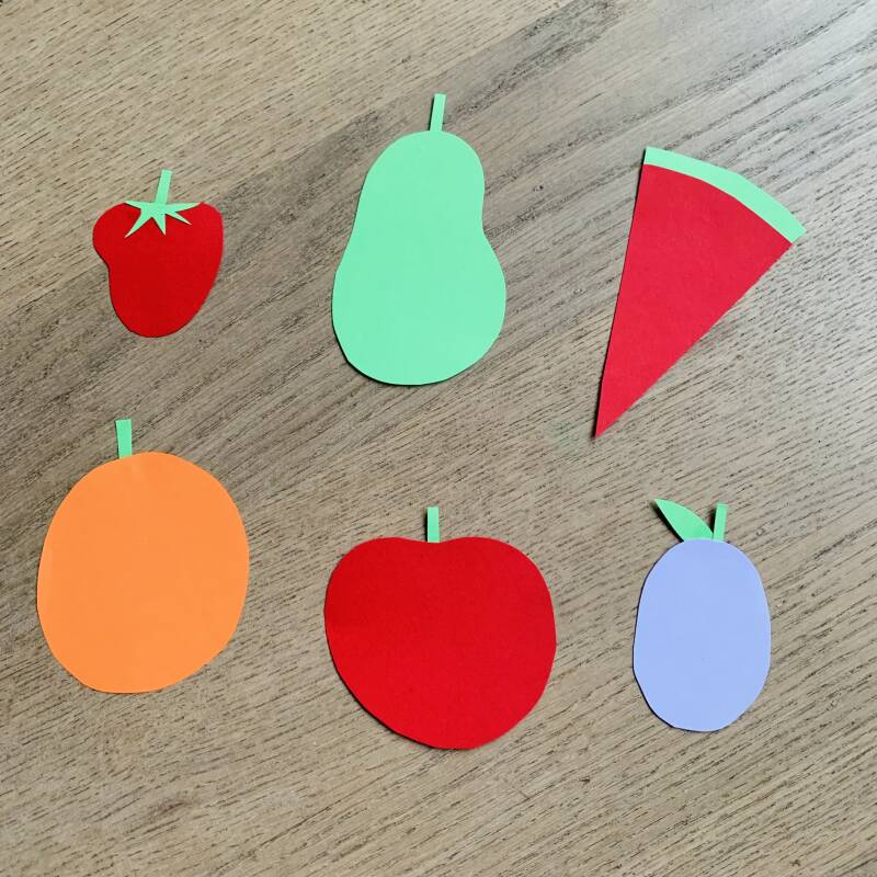 Knip uit gekleurd karton of papier de onderdelen voor het eten van Rupsje Nooitgenoeg. Zie foto. Dit worden een aardbei, peer, watermeloen, sinaasappel, appel en een pruim.