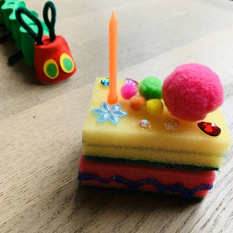 Als je wil kun je ook nog een stukjes taart maken van twee schuursponjes! Plak de schuursponjes met lijm op elkaar en versier ze bijvoorbeeld met pailletjes, knoopjes, edelsteentjes, stift, ponponnetjes en een verjaardagskaarsje.