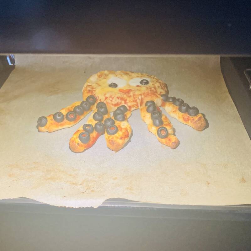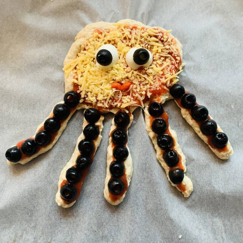 Maak een inktvis van het pizza deeg op een stuk bakpapier. Maak een bal en druk deze plat en rol balletjes tot slierten uit als poten.
