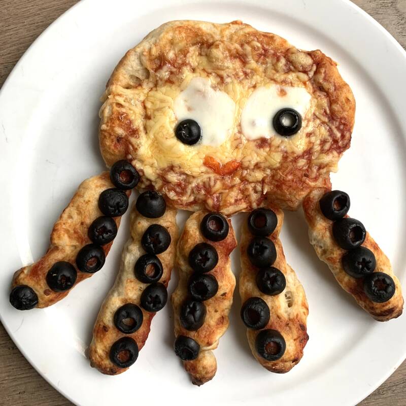 Versier de inktvis nu zoals je zelf wilt. Bijvoorbeeld met stukjes olijven op zijn poten, een stukje paprika als mondje en 2 bolletjes mozzerella en halve olijfjes als ogen.