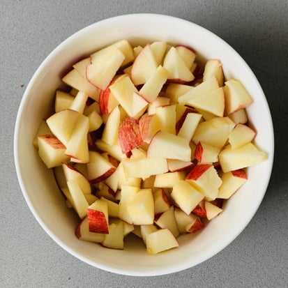 Snijd de appel in kleine stukjes. Laat je kindje vooral helpen hiermee. Je kan kleine plakjes maken en dan kan met een kindermesje je kindje er kleine stukjes van maken. Goed voor de fijne motoriek!