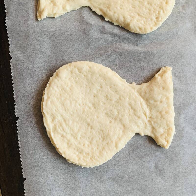 Snijd met een mesje en een kommetje visjes uit het deeg.