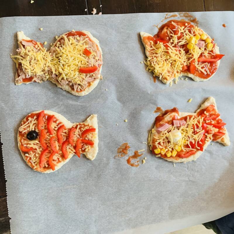 Je kan ook een vis pizza maken van je visjes vorm pizza. Ofwel doe er eerst wat tomatenprut op, dan wat tonijn uit blik en dan geraspte kaas. Dan kun je hem erna nog wat versieren.