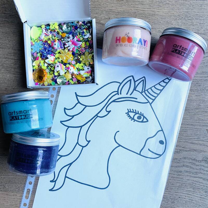 Print de gratis te downloaden kleurplaat van de eenhoorn van Vrolijke Koters uit en stop hem in een plastic hoesje. Pak de klei en je versiersels erbij. Voor deze eenhoorn gebruikte ik de glitters van Glitterbaas en de klei van Artsmart.nl.