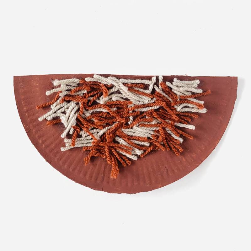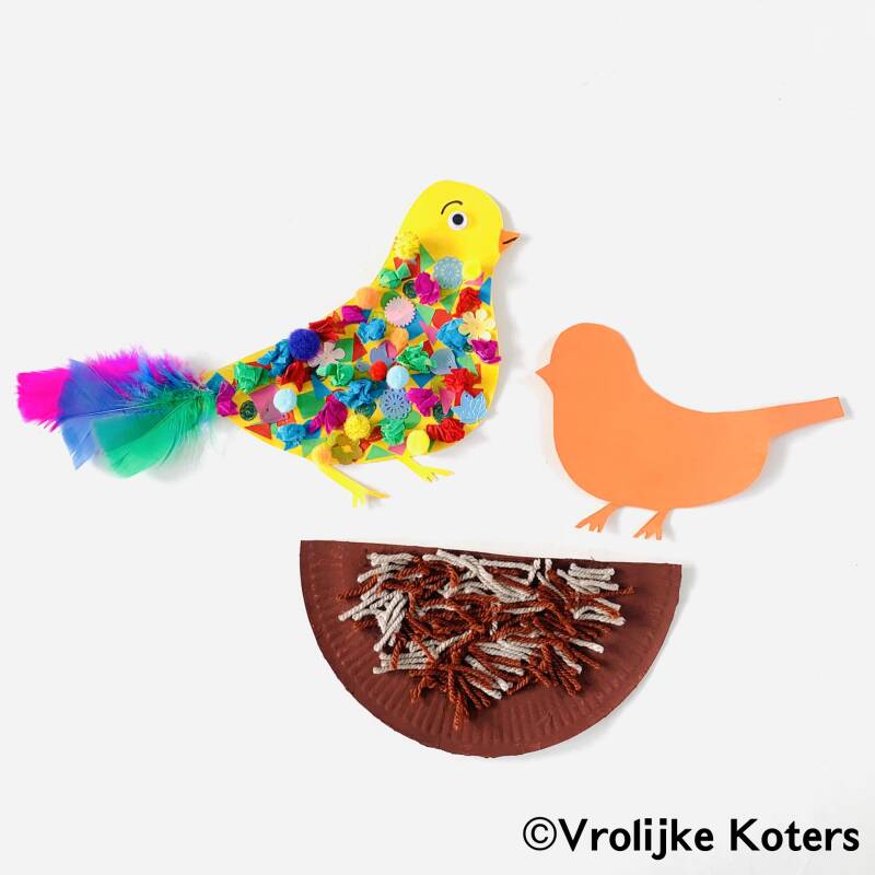 Als je het leuk vindt kun je ook nog een nestje maken voor de vogel. Knip een kartonnen bordje door midden en verf het bruin. Laat het drogen en beplak het daarna met stukjes woldraad. Je kunt natuurlijk ook echte takjes en blaadjes erop plakken!