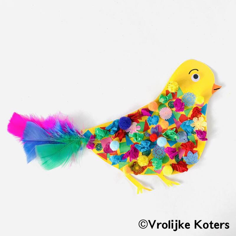 Teken of plak een oogje op de vogel en kleur de snavel in met een oranje stift.