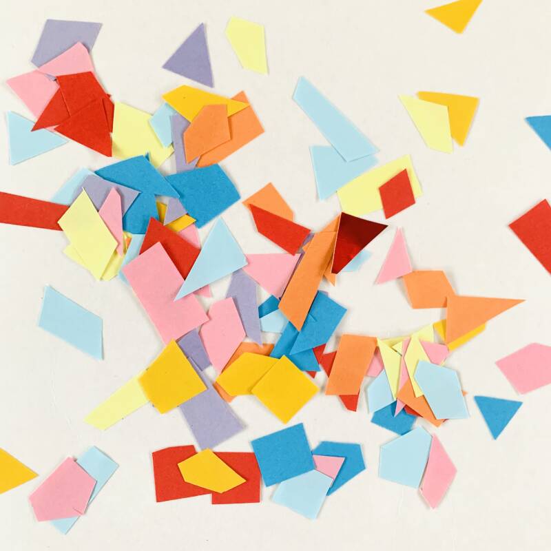 Knip allerlei verschillende vormen stukjes uit gekleurd papier.