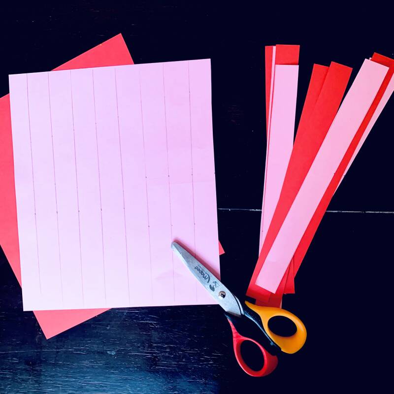 Benodigdheden: roze en rood papier (of alle kleuren van de regenboog als je dat leuk vindt:) liniaal, potlood, schaar en lijm.