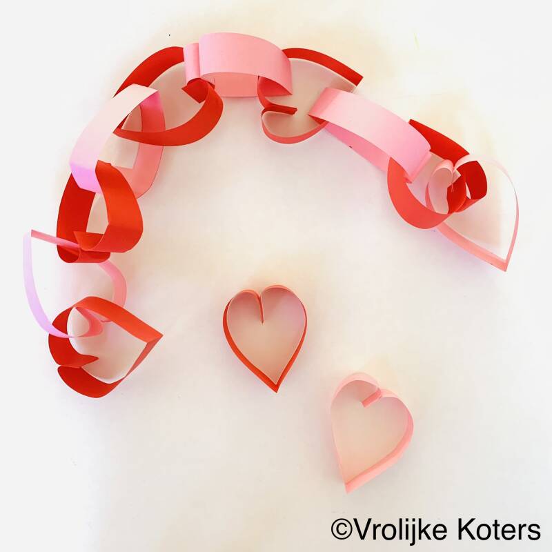 Vouw de stroken in het midden dubbel en plak de bovenkanten vast zoals op de foto. Rijg het volgende hartje door het andere hartje heen voordat je hem vastplakt waardoor er een slinger ontstaat.