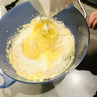 Laat je kindje ook lekker mixen. Let wel op dat de mixer diep in de kom blijft, want anders spat de hele keuken onder met het cakebeslag. Ik spreek uit ervaring ;)