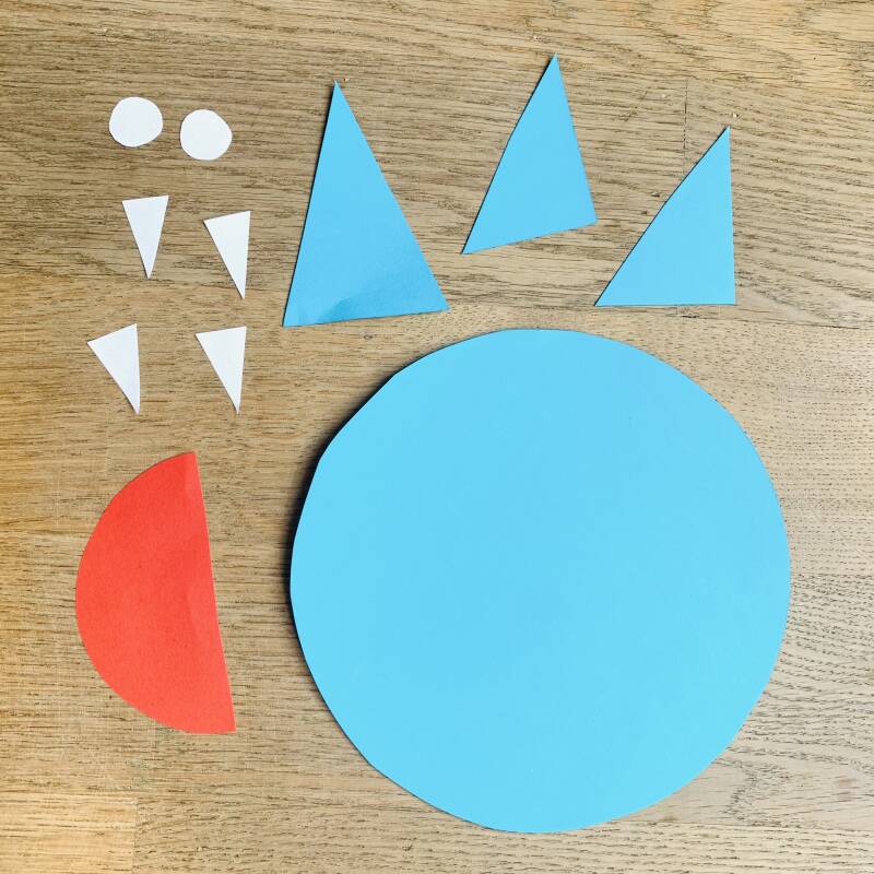 Plak nu aan de achterkant de blauwe driehoeken vast aan de haai. Twee aan de zijkanten en één bovenop zijn kop.