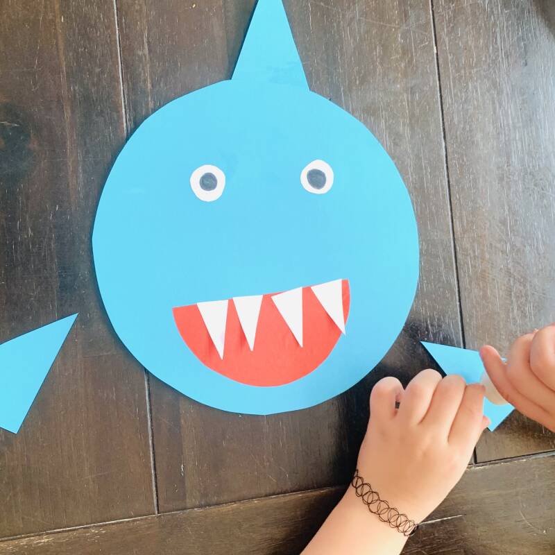 Plak de rode mond op de haai en de witte driehoeken op als tanden.